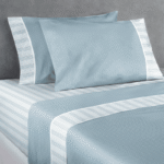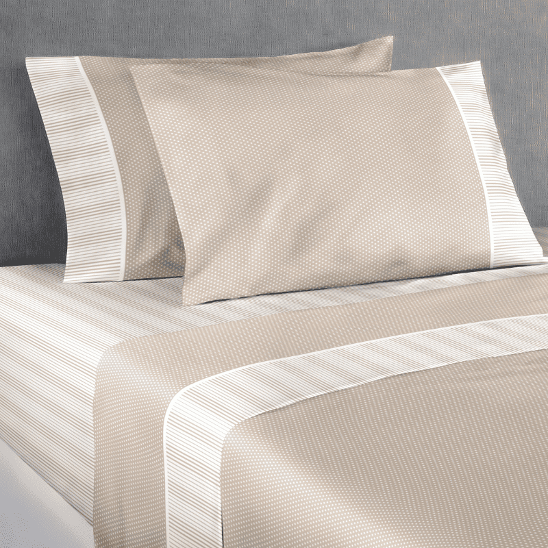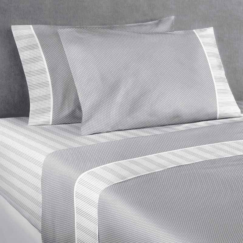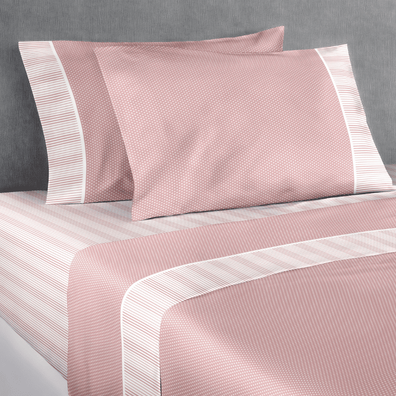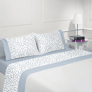 A base do conjunto apresenta riscas discretas que criam uma sensação de organização e continuidade. Por sua vez, o lençol de cima introduz um padrão de pintas suaves, acrescentando leveza ao conjunto. Além disso, a barra superior retoma o padrão de riscas, criando ligação entre as diferentes peças. Dessa forma, o jogo de cama mantém harmonia visual sem se tornar demasiado marcante.