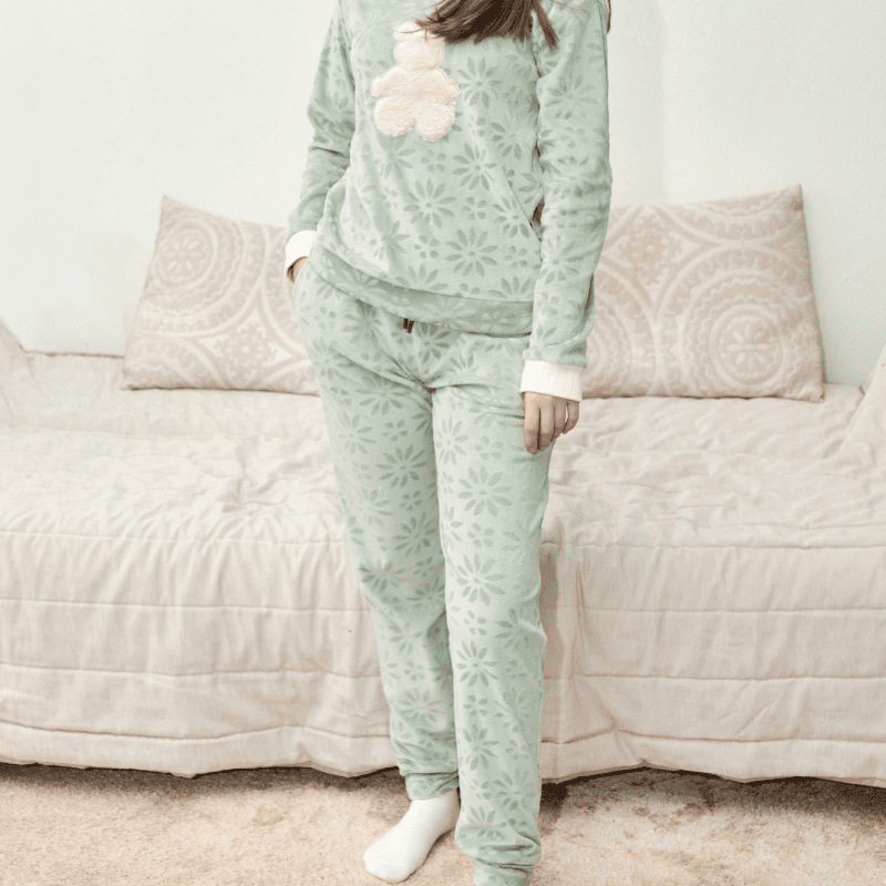 As calças complementam o conjunto com a mesma atenção aos detalhes. Têm punhos na zona inferior, ajudando a manter o pijama confortável junto ao tornozelo e evitando que o tecido suba durante a noite. Além disso, incluem bolsos, o que acrescenta praticidade a uma peça pensada para o conforto. Seja para guardar pequenos objetos ou simplesmente para dar mais funcionalidade ao conjunto, os bolsos tornam as calças ainda mais úteis no uso diário.