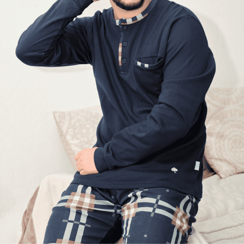 O Pijama Cardado Xadrez Homem oferece conforto consistente e um ar acolhedor para todas as noites frias. As calças apresentam um padrão xadrez clássico, que dá ao conjunto uma presença familiar e marcante. Já a parte de cima, totalmente lisa, inclui um bolso no peito e três botões na gola, criando um visual simples, prático e fácil de usar. Além disso, estes pormenores tornam o pijama mais funcional, sobretudo para quem gosta de ajustar a abertura ao seu gosto ou guardar pequenos objetos.