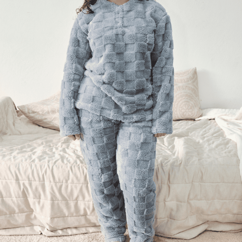 O padrão de quadrados dá ao pijama um visual equilibrado e agradável, mantendo um ar acolhedor e atual. Não é demasiado chamativo, mas apresenta o detalhe suficiente para oferecer algum carácter à peça. Além disso, esta combinação entre a textura da coralina e o padrão geométrico cria um resultado harmonioso, o que torna o pijama fácil de gostar desde o primeiro uso.